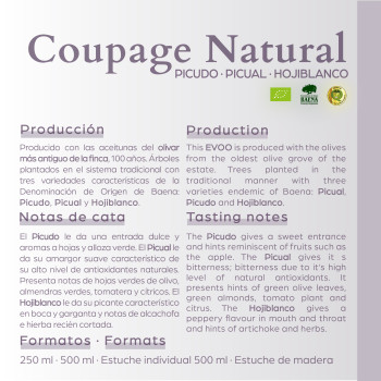 Hergestellt mit Oliven aus dem ältesten Olivenhain des Anwesens, der 100 Jahre alt ist. Die Bäume wurden nach dem traditionellen System mit drei charakteristischen Sorten von Baena gepflanzt: Picudo, Picual und Hojiblanco.