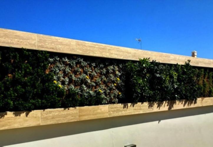 Este espectacular jardín vertical, localizado en una casa particular en Mijas, corre a lo largo del pasillo de entrada de la casa. Este jardín está orientado hacia el oeste, teniendo unas especies resistentes para soportar los atardeceres.